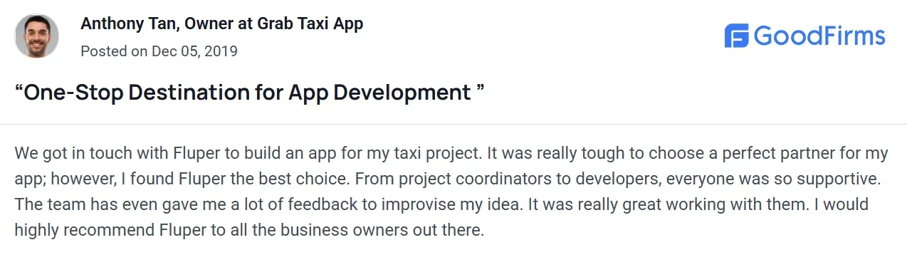 We got in touch with Fluper to build an app for my taxi project. It was really tough to choose a perfect partner for my app; however, I found Fluper the best choice. From project coordinators to developers, everyone was so supportive. The team has even gave me a lot of feedback to improvise my idea. It was really great working with them.